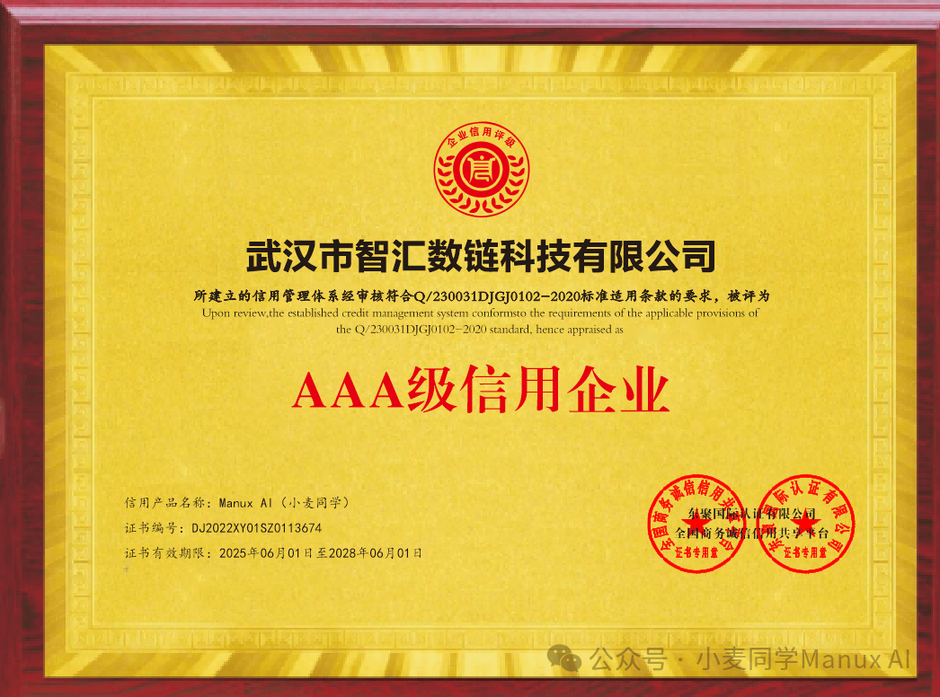 并通过量子生物科学等前沿手艺迭代,强强背书印证 AI 正在多模态交互、使命从动化等范畴的领先实力。办事数字政务扶植。将来将加快全球化结构,无需切换 App,完成国产化适配(麒麟操做系统、达梦数据库),力争成为Web4.0时代的“AI生态枢纽”。赋能国际智能合做。建立 “手艺 + 安全” 双沉平安防地Manux AI 是面向 Web4.0 时代的 AI 糊口办事平台,焦点用处:兑换 “小麦机械人”(如 V1-V7 分歧版本),来自全球顶尖高校取科技企业,获 “一带一” 国宾伴手礼认证,价值持续提拔,鞭策生态增加。双积分经济系统(MT/GMT)通过智能合约实现通明化运营,无需切换 App!