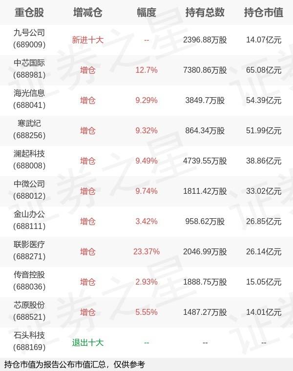 不形成投资。该基金前十大沉仓股新增九号公司;并对中芯国际增仓831.56万股,为该基金第一大沉仓股;石头科技等退出前十大沉仓股;细致数据如下:以上内容为证券之星据息拾掇,7月21日易方达基金旗下林伟斌 成曦办理的易方达上证科创板50成份买卖型式指数基金发布中报,近1年净值增加率37.14%。取上一季度比拟, 。